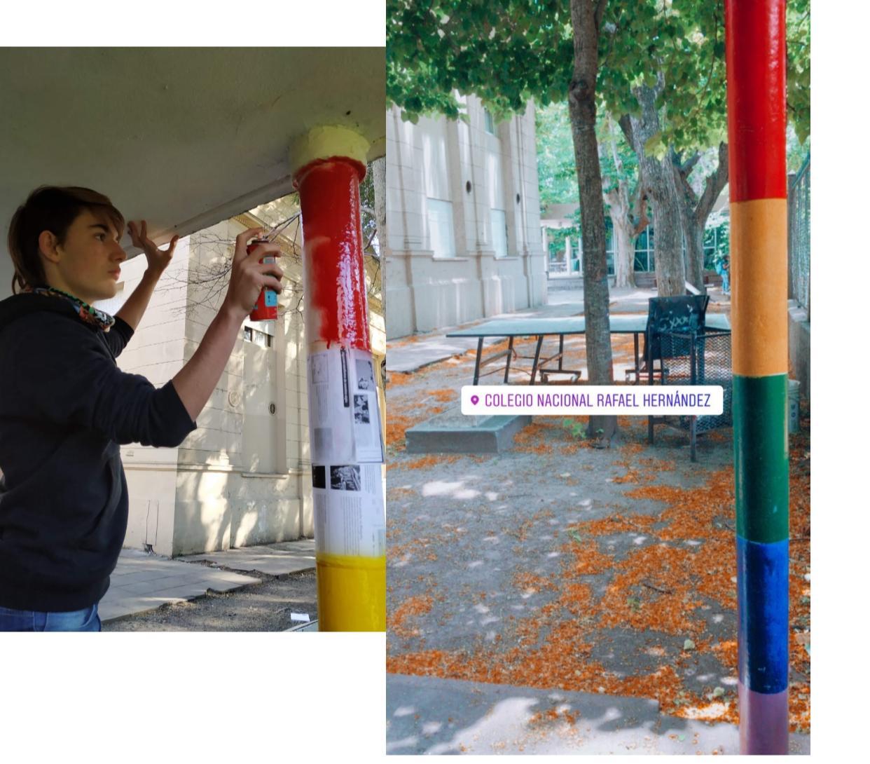 En el marco de la semana del orgullo, pintamos las columnas del cuartucho con los colores de la bandera LGBTIQ+ y realizamos una intervención con infromación para que cada unx pueda acercarse a leer y llevarse material a su casa.